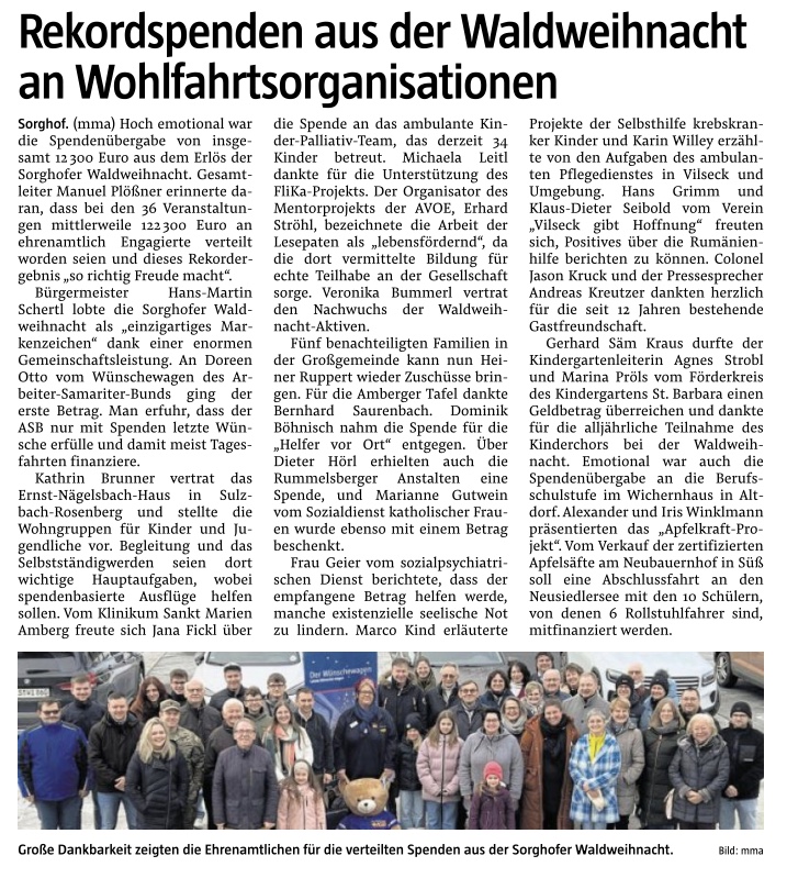 Vielen herzlichen Dank an alle, die bei der Waldweihnacht aktiv dabei waren und allen Helfern für das tolle Engagement. Somit konnten 12.300 € aus dem Erlös der Sorghofer Waldweihnacht übergeben werden. Die Selbsthilfegruppe krebsksranker Kinder Amberg-Sulzbach e.V. bekam 500 €. Wir sagen besonderen Dank an die Organisatoren Manuel Plößner und Säm Kraus. ❤️❤️❤️