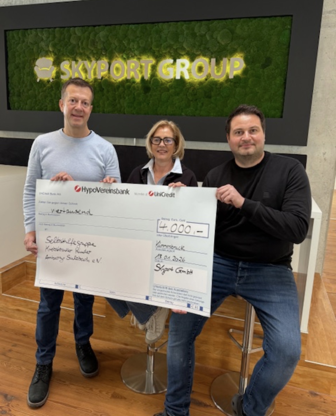 Die beiden Geschäftsführer der Fa. Skyport Group GmbH Florian Kistner, re. und Daniel Schumacher, li. übergaben an die Selbsthilfegruppe krebskranker Kinder Amberg-Sulzbach e.V. einen Spendenscheck in Höhe von 4.000 €. Vielen herzlichen Dank für die großzügige Spende. Wir haben uns sehr darüber gefreut. ❤️❤️❤️